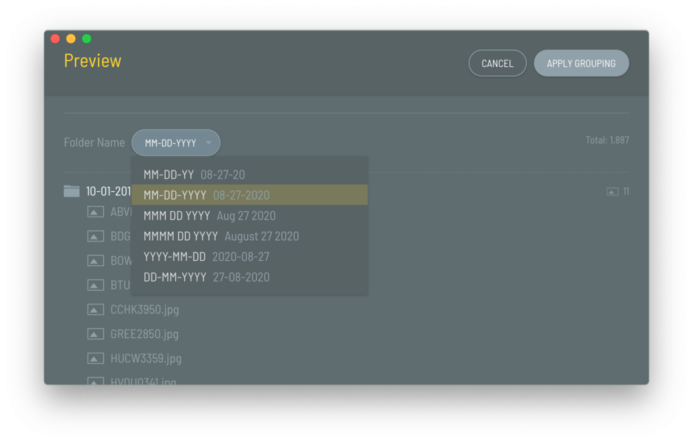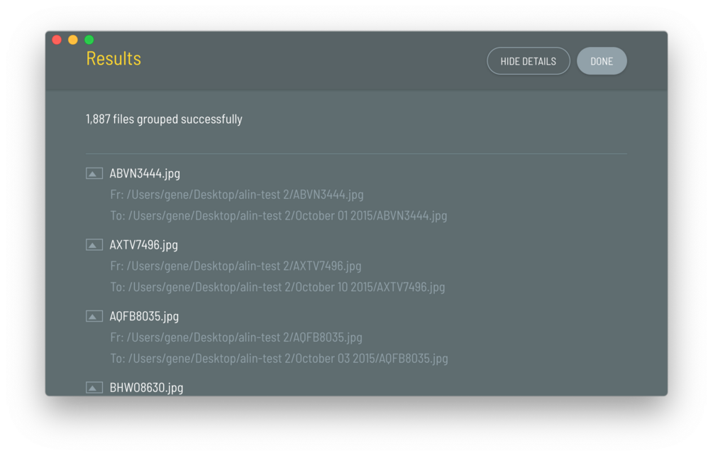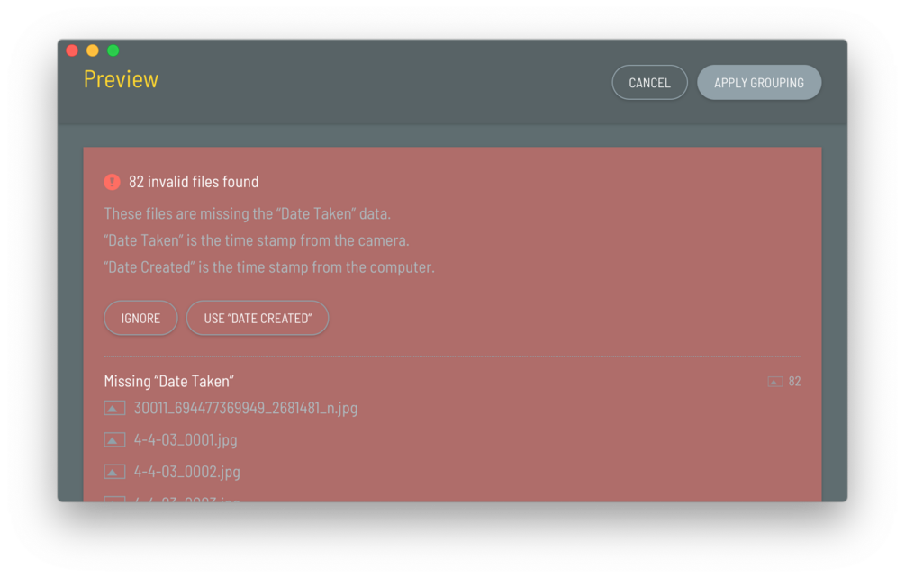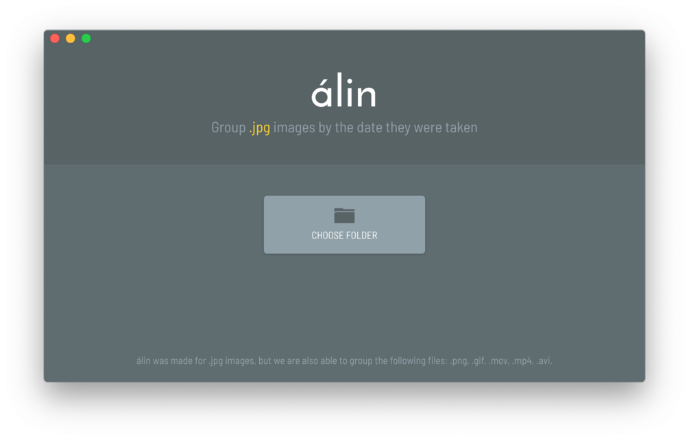 The app was specifically built for .jpg images, however, it is also able to organize .png, .gif, .mov, .mp4, and .avi files. Alin is only able to organized files with "Date Taken" and "Date Created" data. If your image or file is missing these meta data, Alin will be unable to organize them.